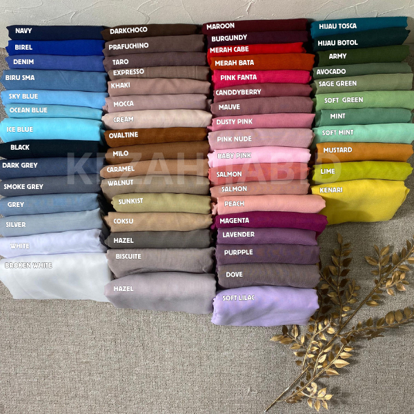 Black, Navy, Maroon, Dusty Pink, Siena Brown, Choco Cream, Choco Milk, Pastel Pink, Mustard, Emerald Green, Silver Grey, Ocean Blue, Mocca, Army, White, Dark Gray, Khaki, Pastel Green, Lemon, Hazel, Broken white, Mint, Medium Grey, Burgundy, Walnut, Truffle, Smoke Grey, Taro, Purpple, Rose Pink, Pink Baby, Denim, Flowrest Purple, Coffe, Sky blue, Fuchia, Biscuite, Praffuchino, Lime, Expreso, Soft Denim, Caramel, Pink Peach, Ice Blue, Sunkist, Ivory, Sage, Light Purple, Teal Green, Magenta