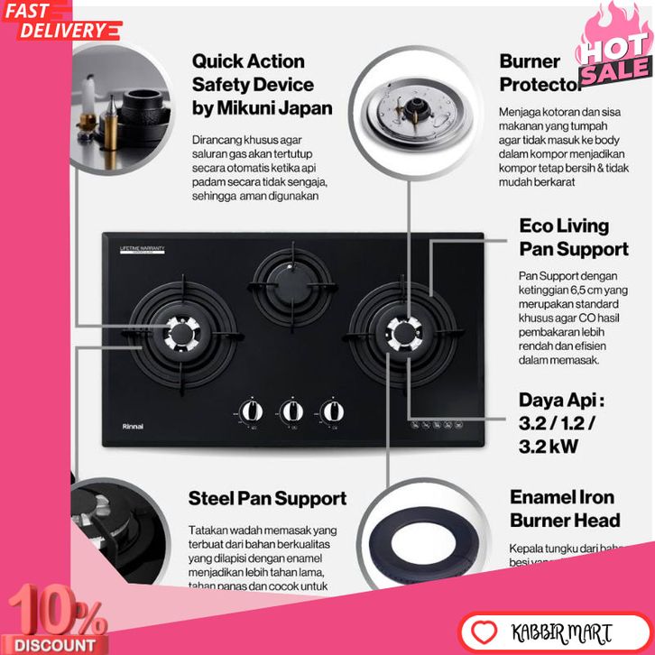 RINNAI BUILT IN GAS HOB KOMPOR GAS TANAM 3 TUNGKU RINNAI RB 773RO G RB773ROG RB 773ROG