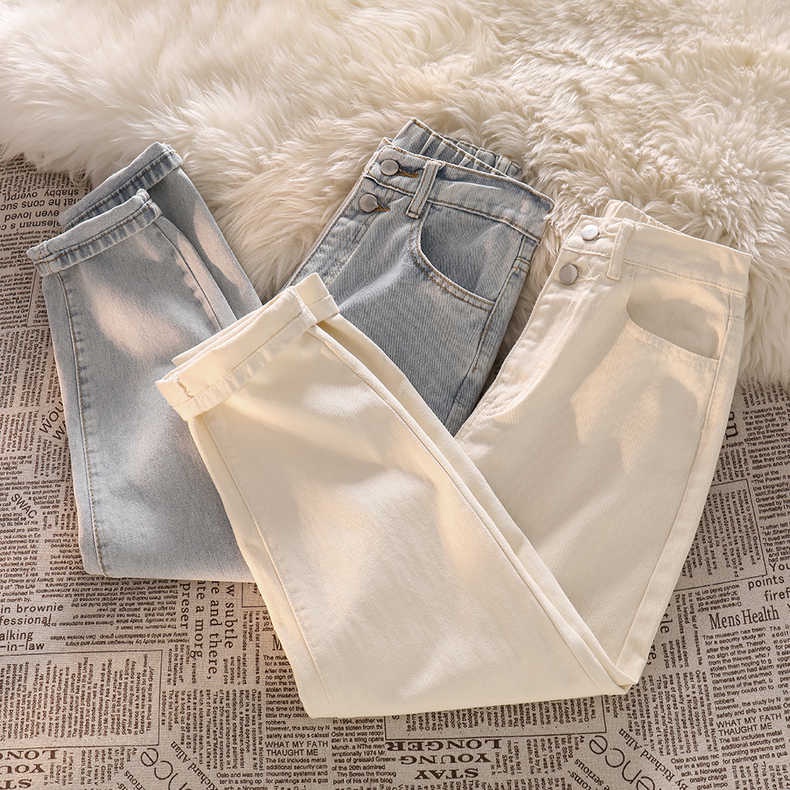 Celana High Waist Wanita Biru Cream Celana Jeans Wanita Straight Kekinian Import 9237 Bebas Ongkir