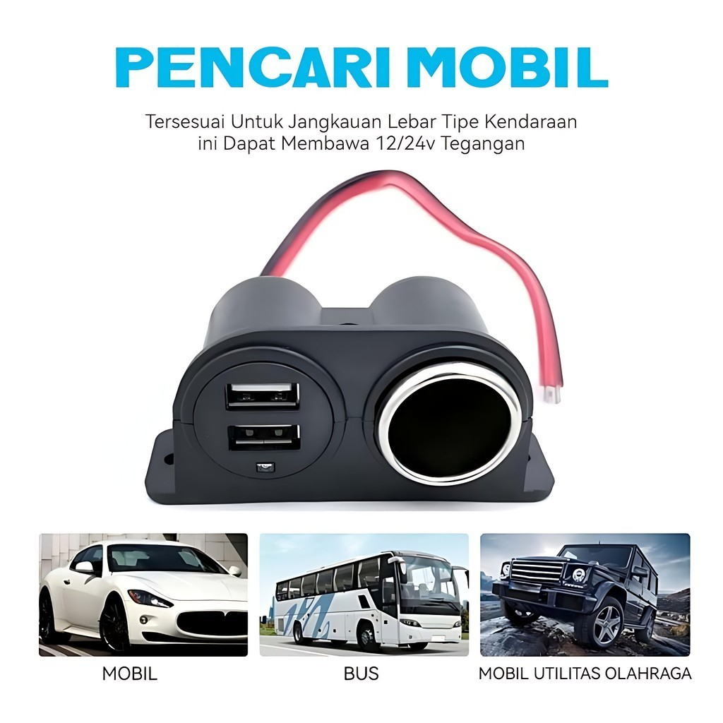 Car Charger Mobil 2 USB Port + Cigarette Lighter Plug Adapter 3.1 A multifungsi Colokan Mobil