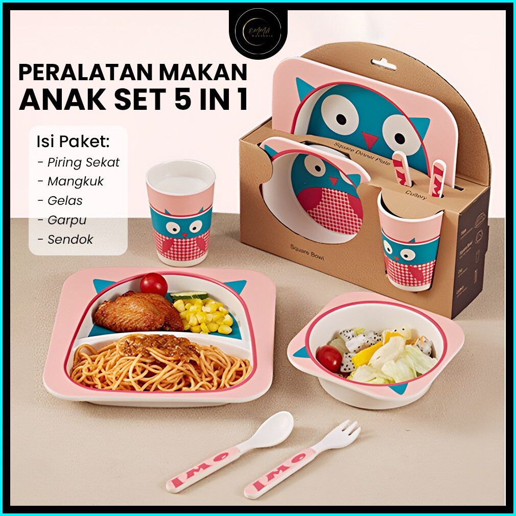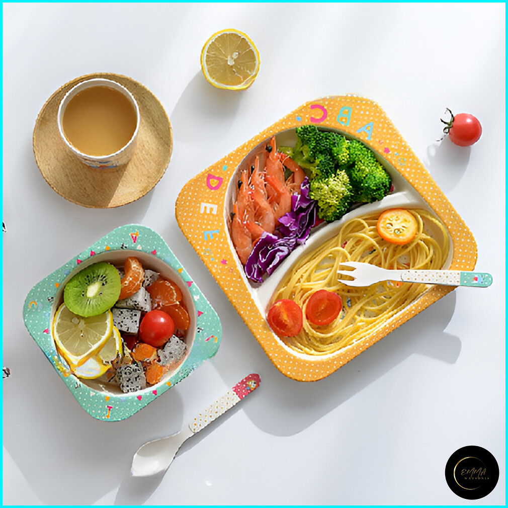 Em Peralatan Makan Anak Set 5 In 1 Tableware Bamboo Motif Kartun