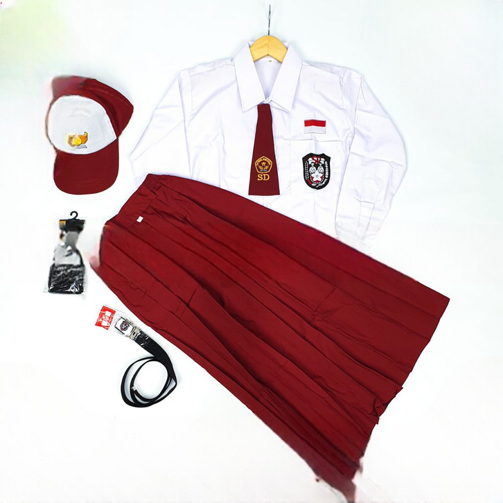 Setelan Super Lengkap Seragam Sekolah SD Merah Putih Lengan Panjang Perempuan Kelas 1-6 SD