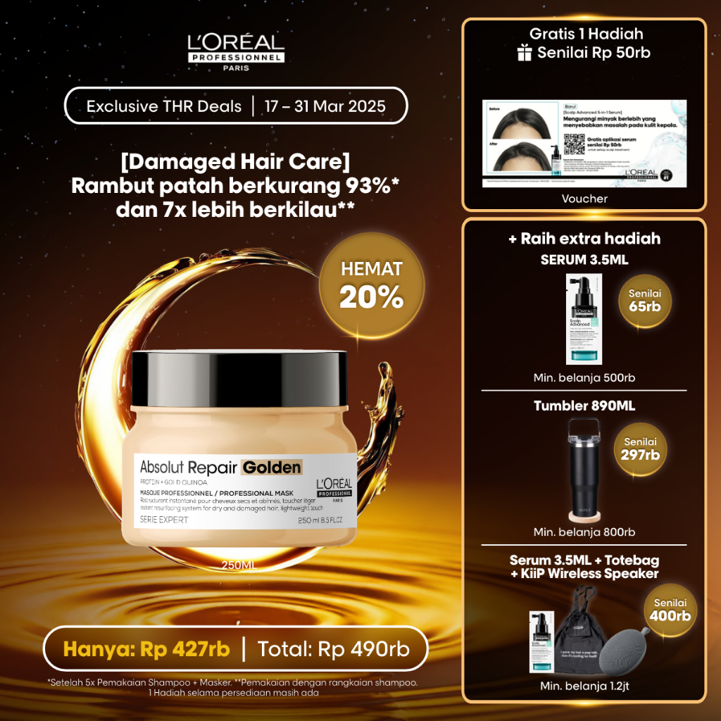 Serie Expert Absolut Repair Golden Hair Mask 250 ml Untuk Rambut Rusak by L'Oreal Professionnel READY STOCK