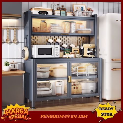 Rak Dapur Lemari Dapur Dengan Pintu Rak Penyimpanan Microwave Oven Rak Multi Lapisan Lemari Piring Lantai Berdiri