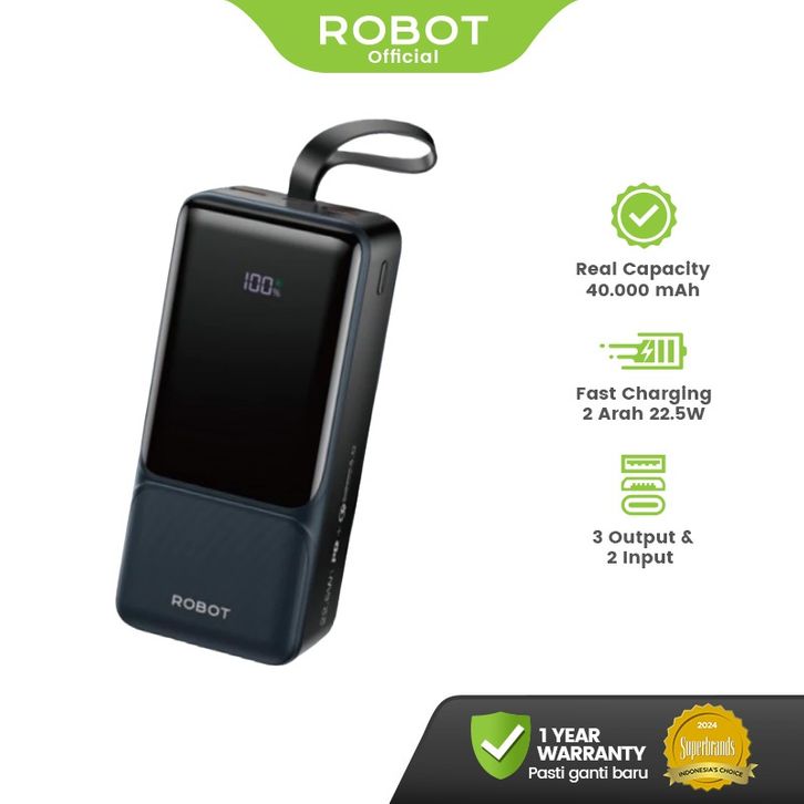 ROBOT Powerbank Fast Charging 22.5W 40.000mAh Real Capacity 3 Port USB Type C RT40 Original - Garansi 1 Tahun