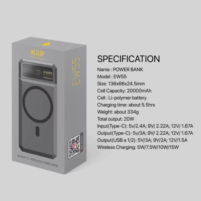 Terlaris KiiP Wireless EW55 Powerbank 20W 20000mAh Magnetic iPhone 14 15 - Grey Promo
