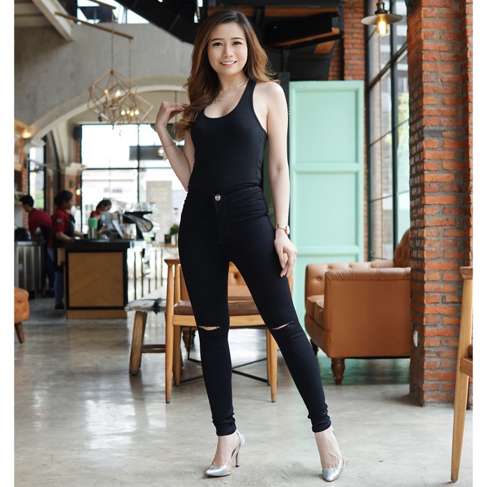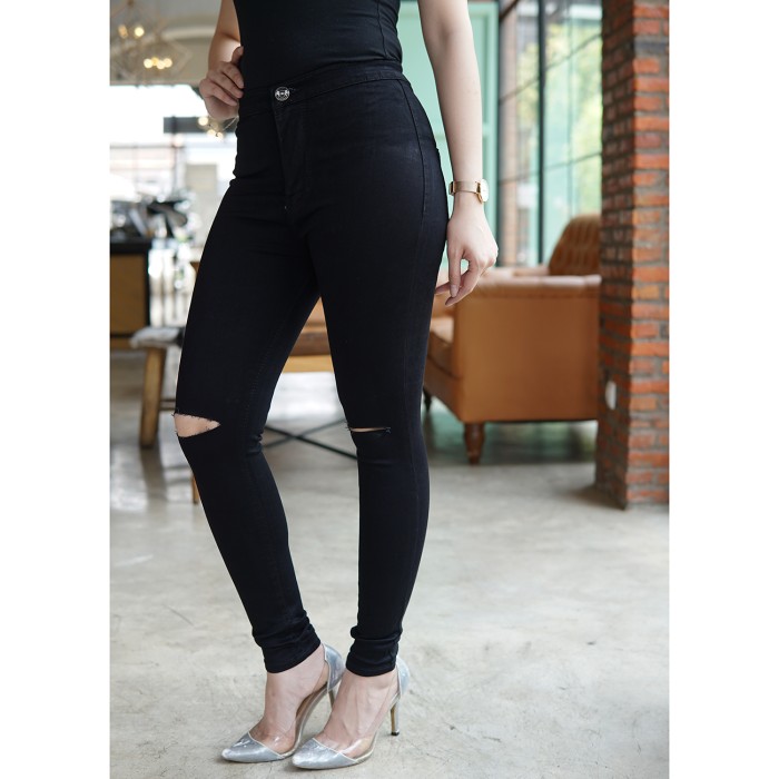 [PROMO]CELANA JEANS HIGHWAIST WANITA / HW HITAM SOBEK LUTUT / RIPPED KNEESIZE 28