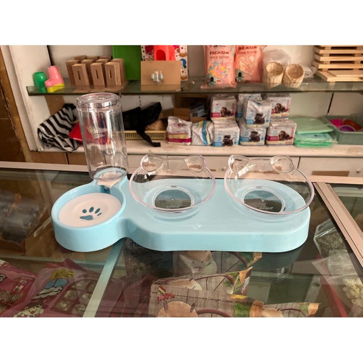 Pet Double Bowl Tempat Makan Minum Dispenser 3 in 1 Set Anjing Kucing Kelinci terlaris, termurah,