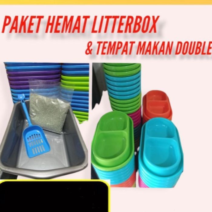 Bak Pasir Abu + Tempat Makan Double GRATIS Sekop & Pasir Pup Kucing 1 Set Paket Kucing Anjing