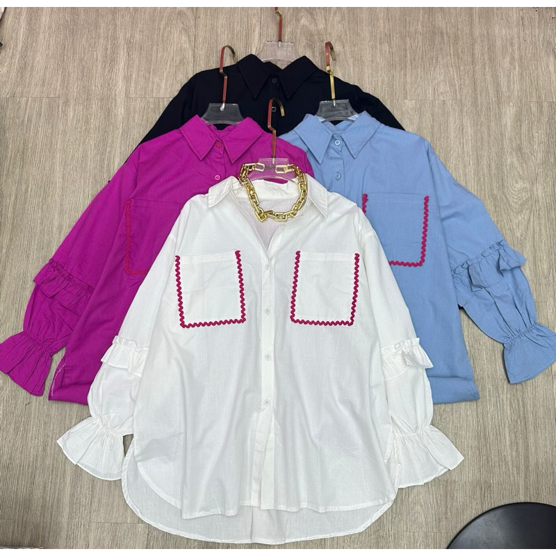 Kemeja Wanita Lengan Pendek Bahan Katun Polos Saku Depan Renda Kancing Busui Blouse Oversize