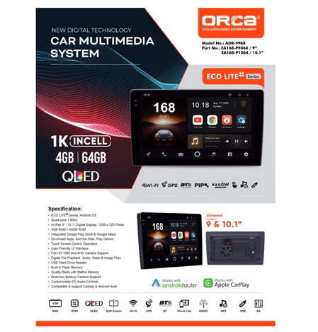 Head Unit Android Orca Adr-9988 9” / 10” Inch Ram 4+64GB Eco Lite+ Series 1K Qled Universal