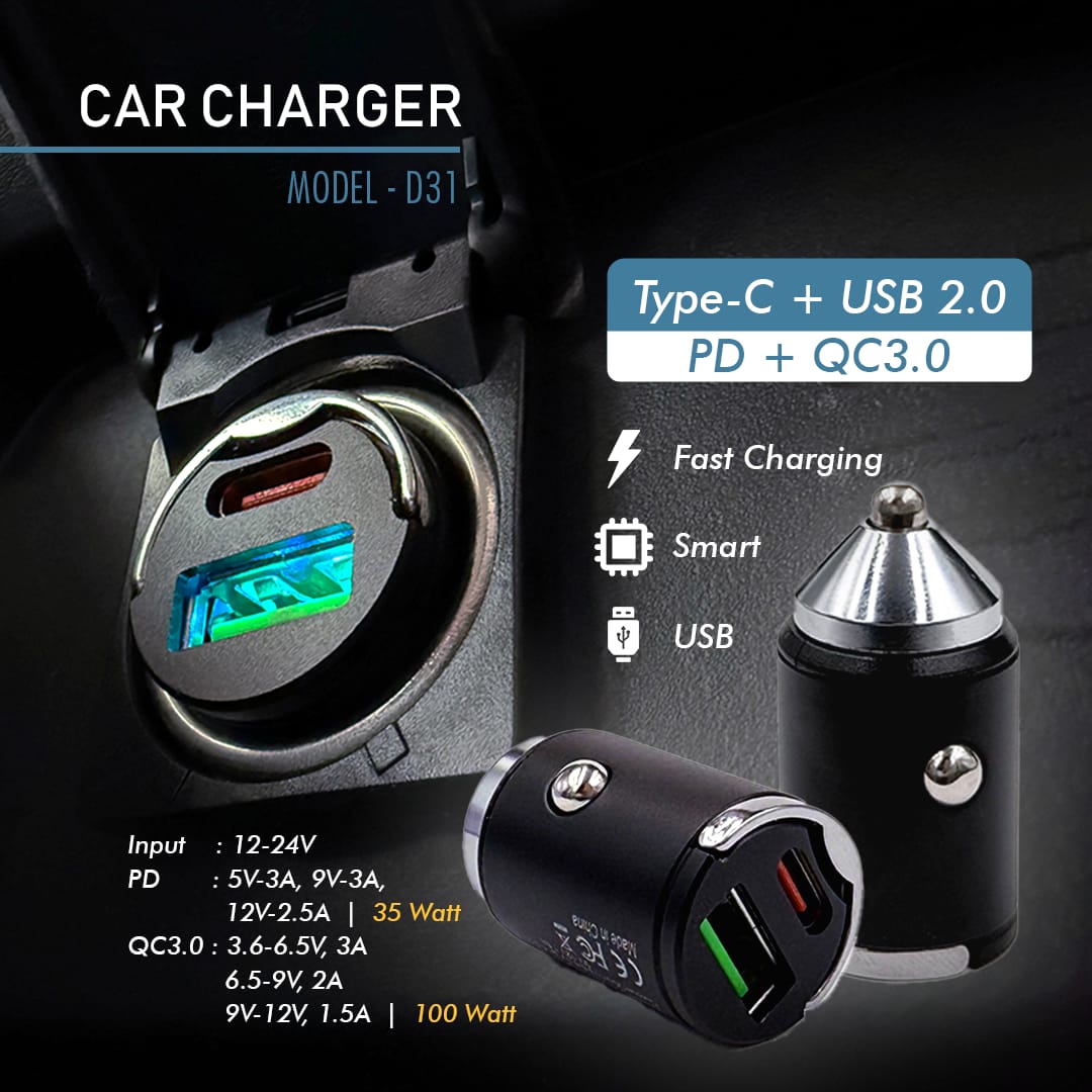 CAR CHARGER COLOKAN MOBIL D-31 DUAL PORT USB A & TYPE C FAST CHARGING 35W 100W
