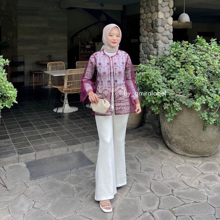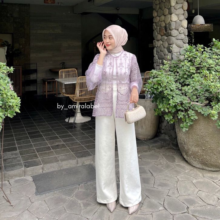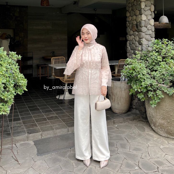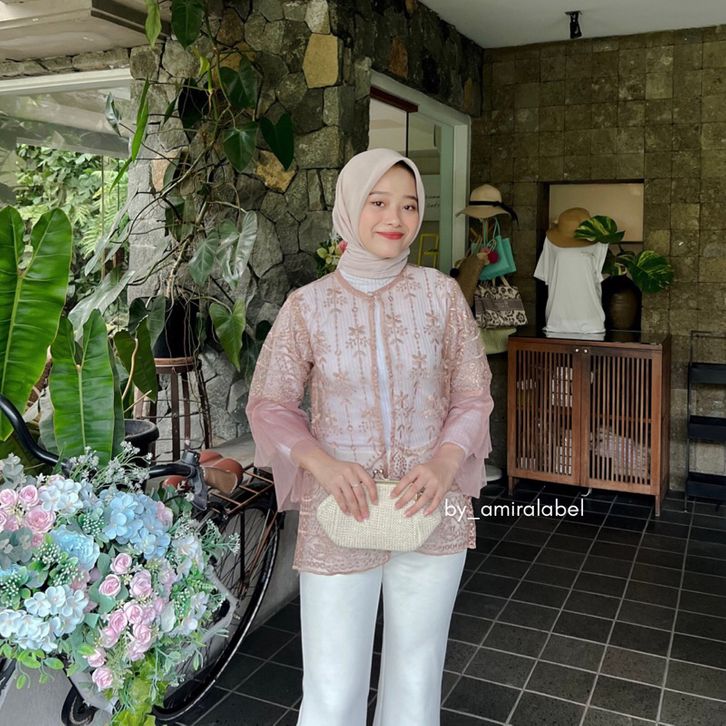 Sepia Outer Brokat Kombinasi Tille Outfit Baju Kondangan Wanita Modern Simple Elegan Terbaru Kekinian