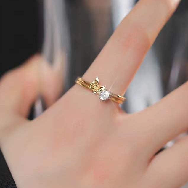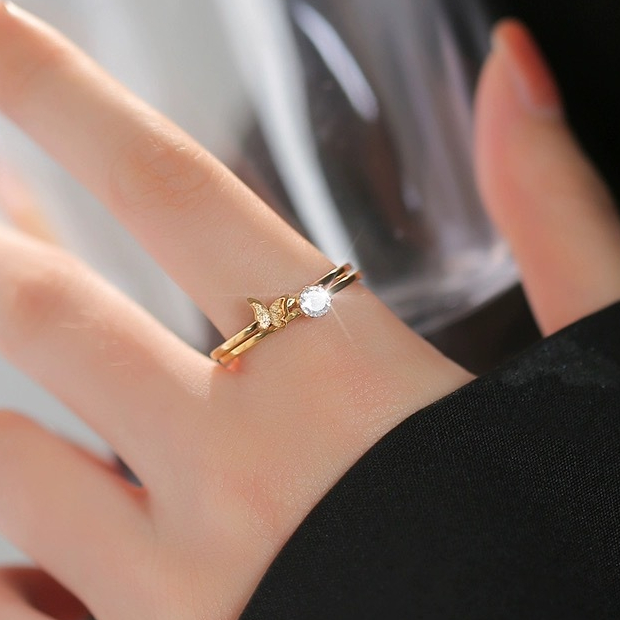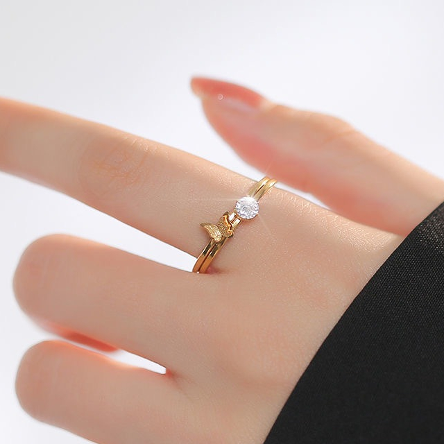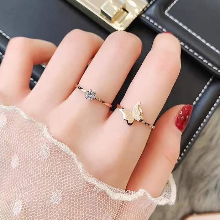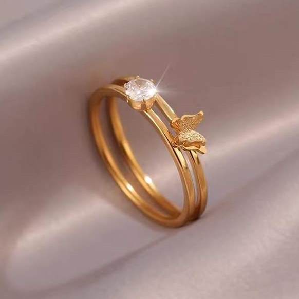 C32 Cincin Titanium Premium Wanita Kupu-Kupu Eksotis Musim Semi Korea Style Double Ring Anti Karat