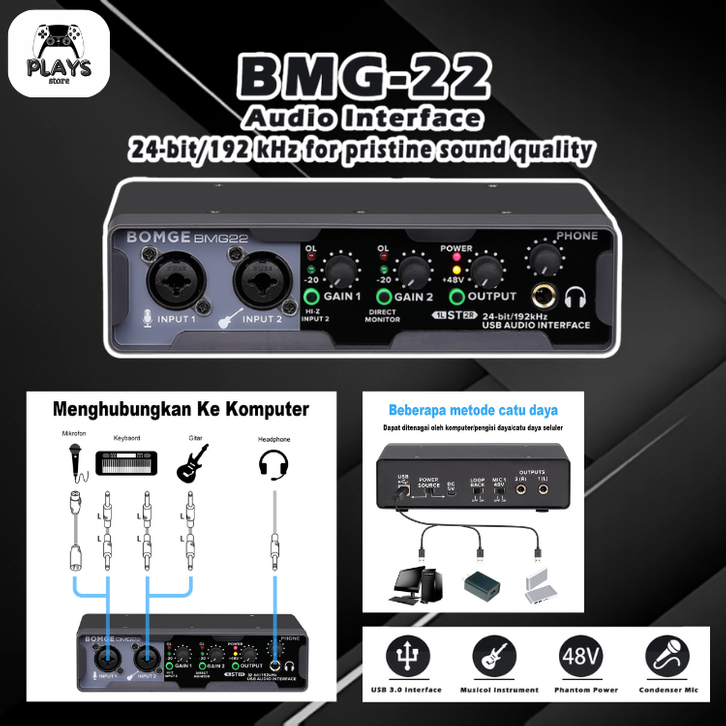 BMG-22 Sound card audio interface recording USB interface (32 bit/192 kHz) dengan XLR, daya hantu, Pemantauan Langsung