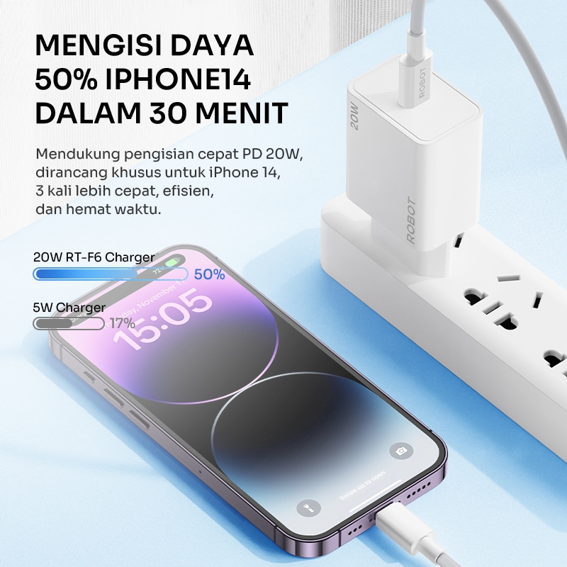 Charger Iphone ROBOT USB C 20W RT-F6 Output Port 3A Free Kabel USB C to Lightning 7 Protection - Garansi 1 Tahun