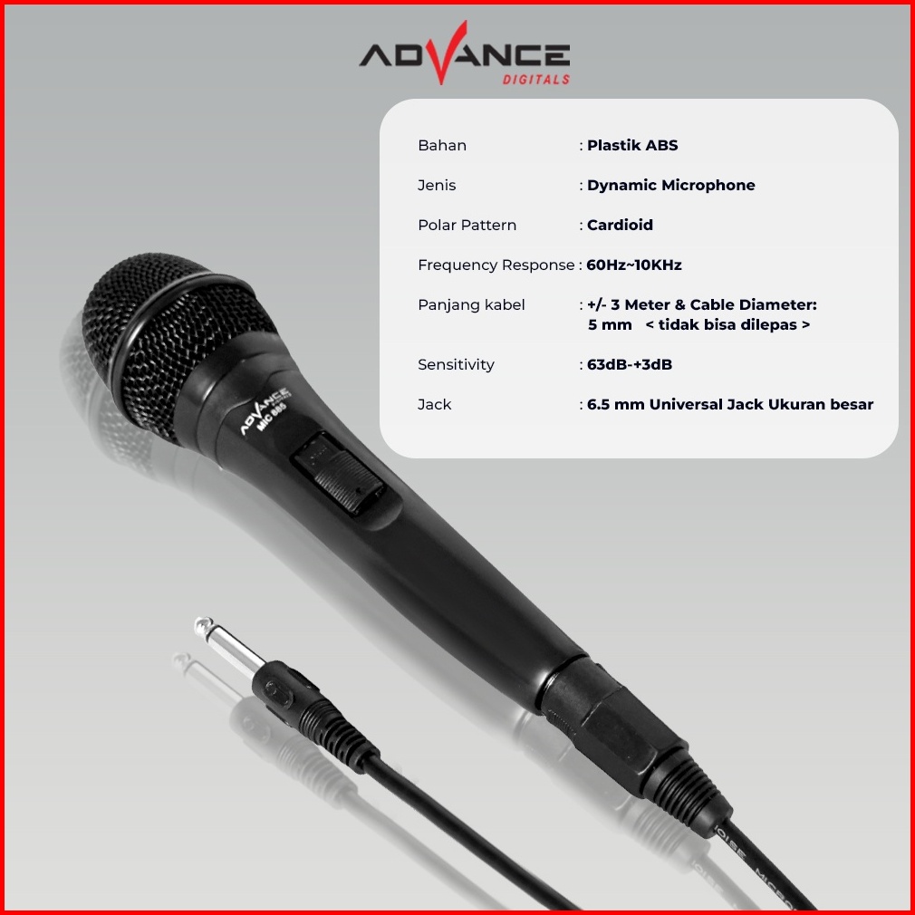 Advance Mic-885 Single Profesional Dynamic Microphone Speaker Mic Kabel Microphone Premium Jack Besar 6.5mm