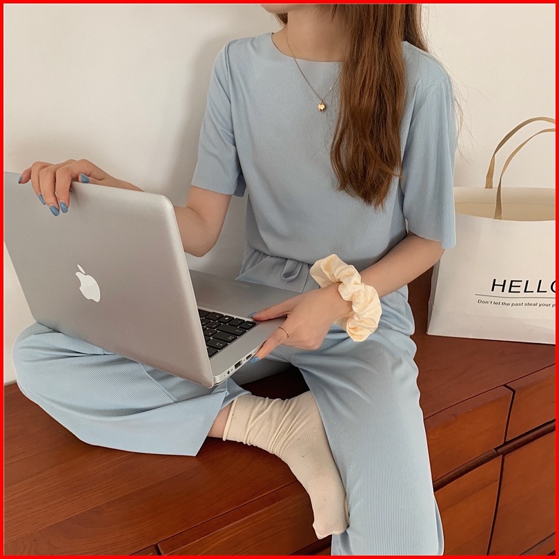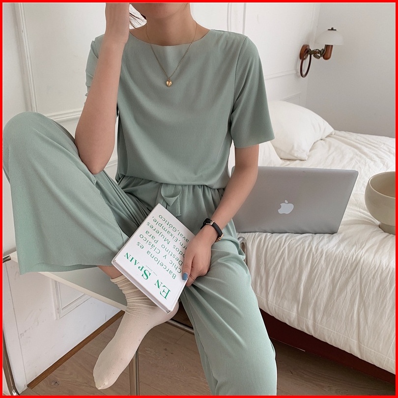 Uninice Set Piyama Longgar Warna Polos Wanita Bahan Sutra Es Pakaian Rumah Keren Set Kaus Dan Celana Sejuk Jumbo