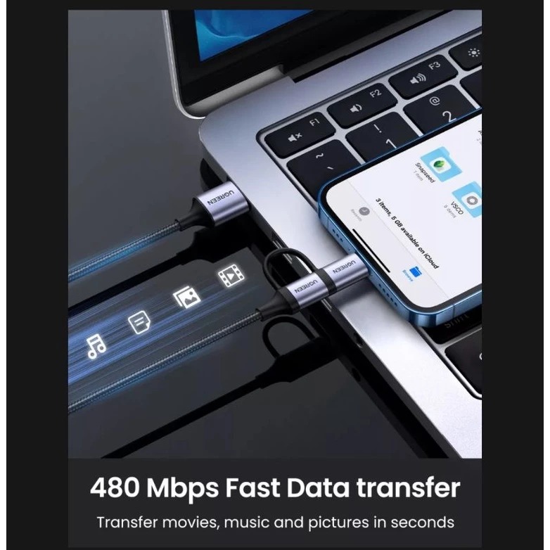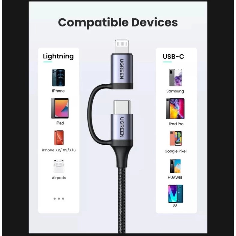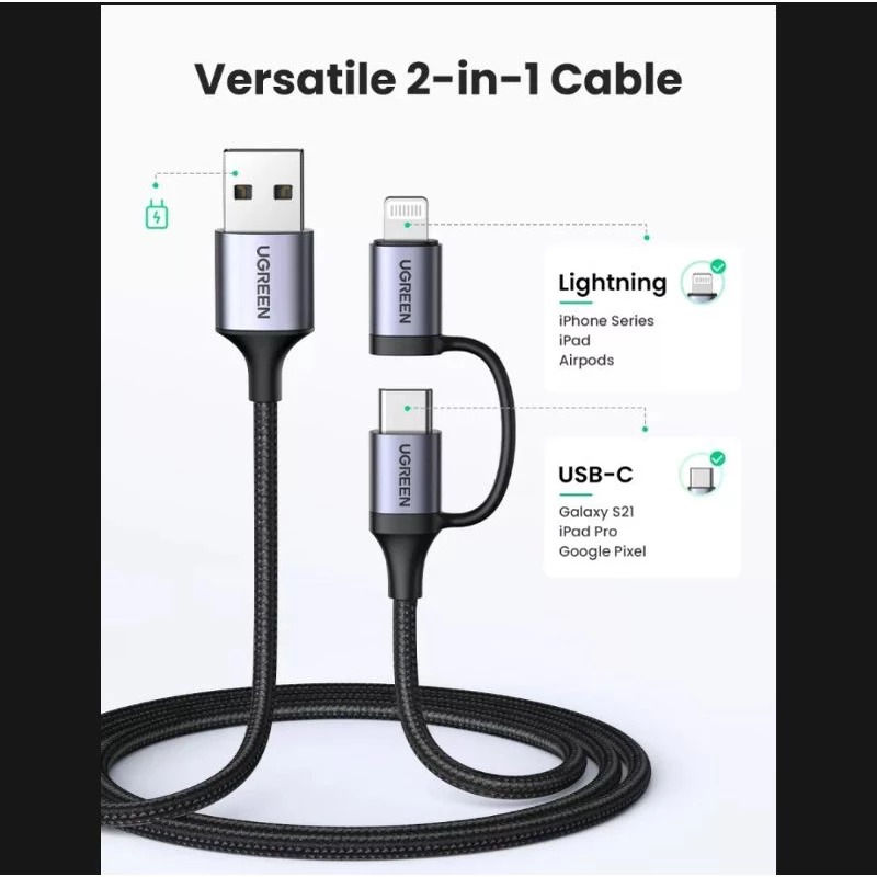 Kabel Charger/Data Ugreen 2in1 3A USB Cable MFi Lightning - Type C Fast Charging Android iPhone (GRATIS ONGKIR)