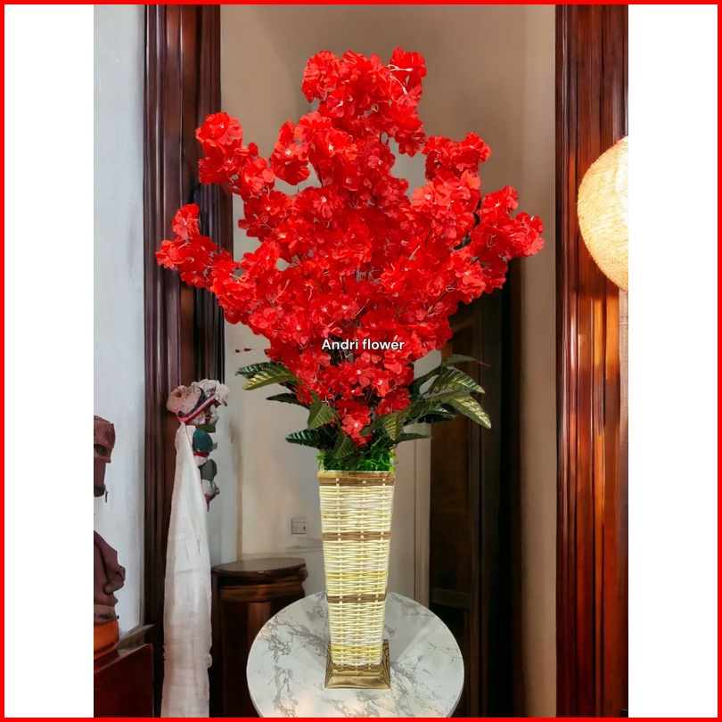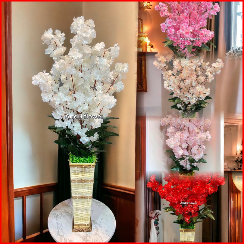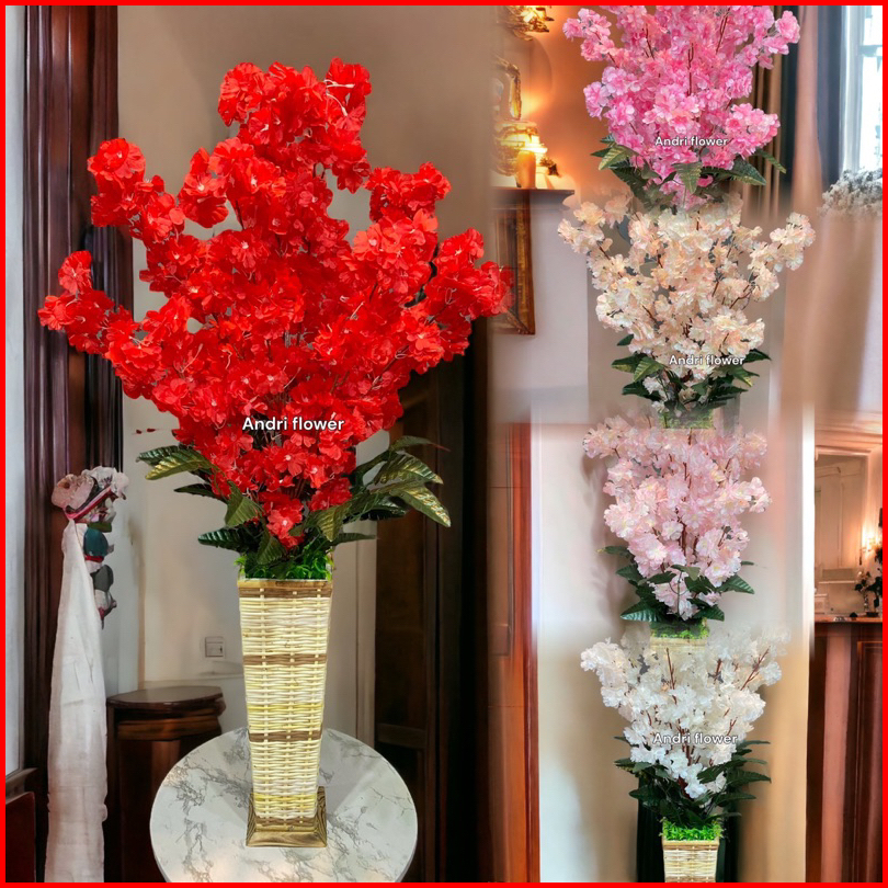 Bunga Hias Sakura Belosom Cabang 12 Dengan Pot Rotan 40 Cm