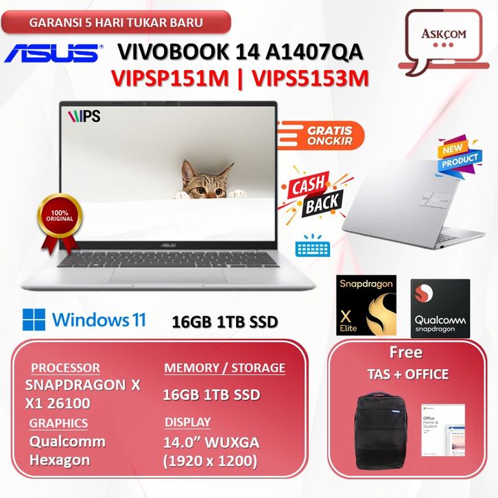 Asus VivoBook 14 A1407QA Snapdargon X X1 26100 16GB 1TB SSD W11+OHS 14.0 WUXGA VIPS VIPSP151M