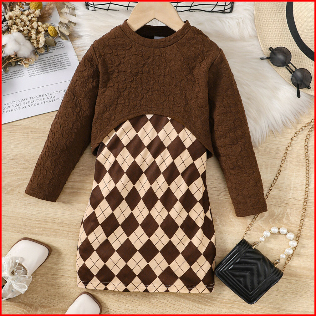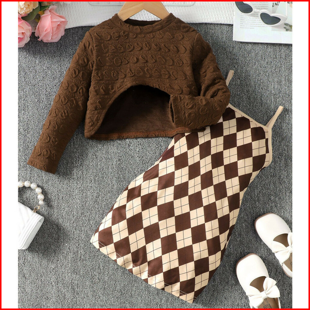 1-8years Kids Baju Baby Girl Autumn Daily Clothes Set Long Sleeve Top Strap Plaid Dress Lovely Fashion 2pcs Outfit