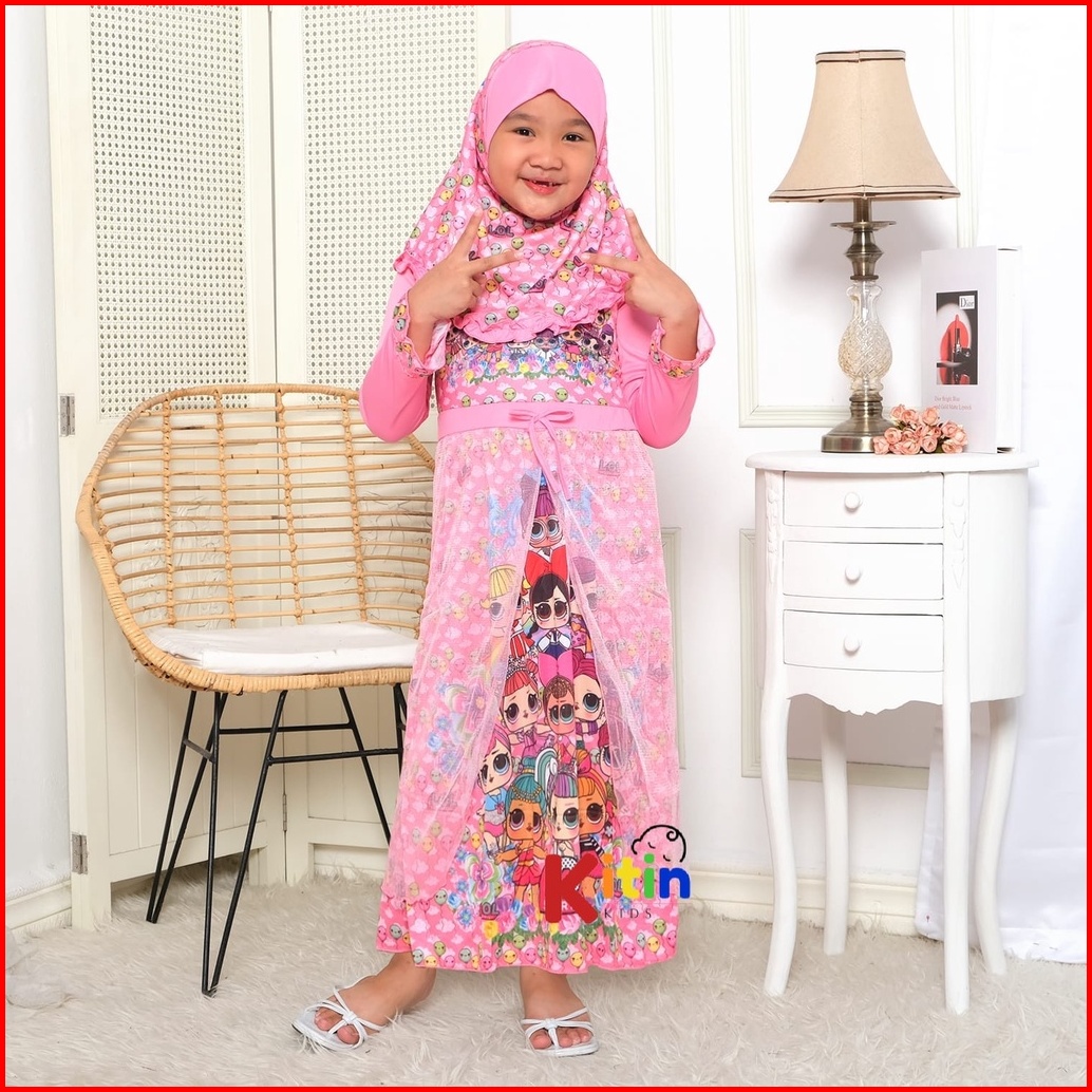 Ly Tile - Gamis Anak Overall Printing Set Hijab 5-11 Tahun Baju Muslim Ngaji Anak Perempuan Motif Frozen Poni Lol Bahan