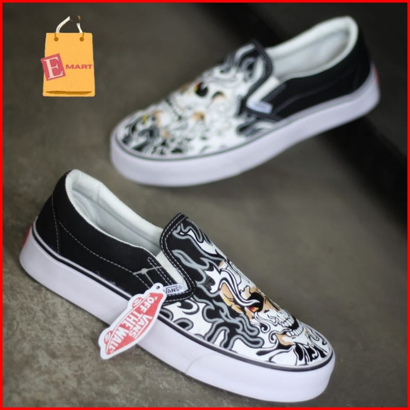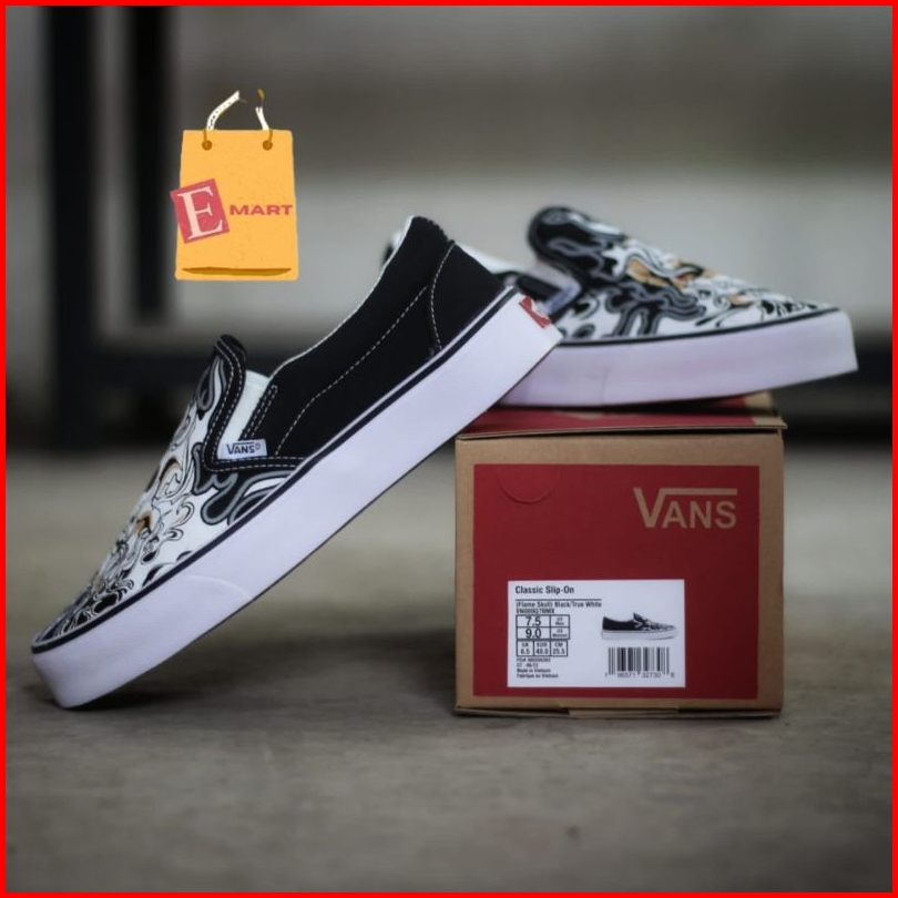 Promo Sepatu Casual Pria Dan Wanita Sneakers Slip On Flame Skull Black True White Premium Import Quality Tag Made In Vie