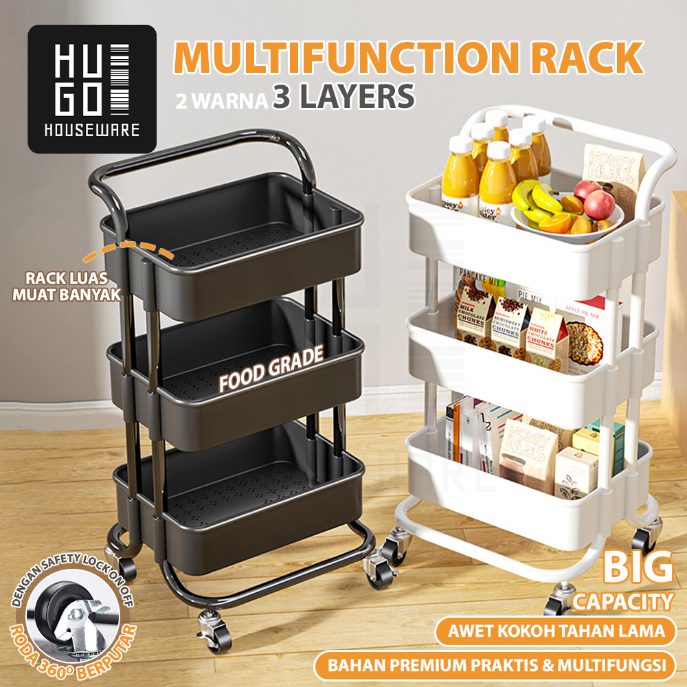HUGO Rak Dapur Dorong Besi Stainless Steel Rak Troli Susun Serbaguna dengan Roda dan Pegangan