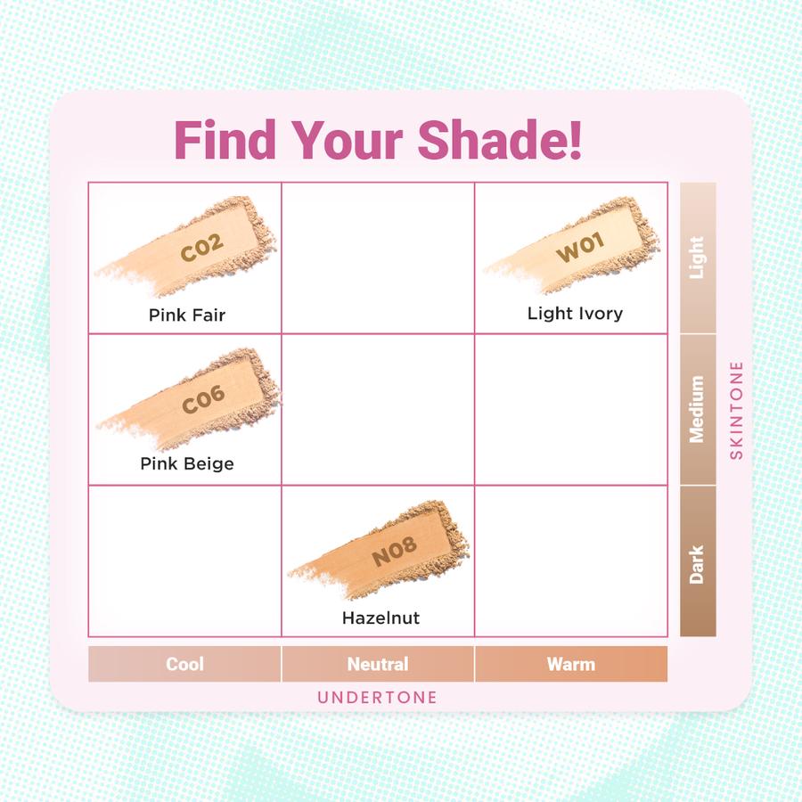 C06 Pink Beige , W01 Light Ivory, N08 Hazelnut , C02 Pink Fair