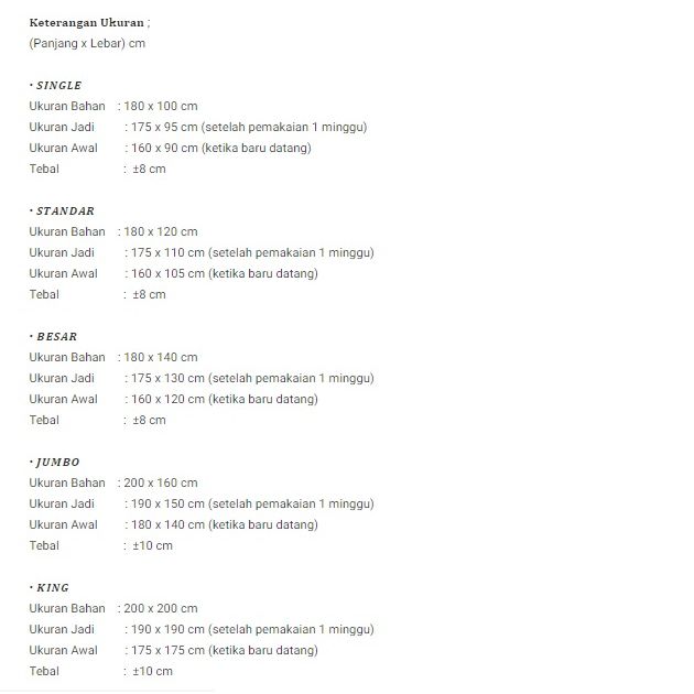 Besar (muat 2+ org), JUMBO (muat 3 org), KING (muat 4 org), Single (muat 1 org), Standar (muat 2 org)