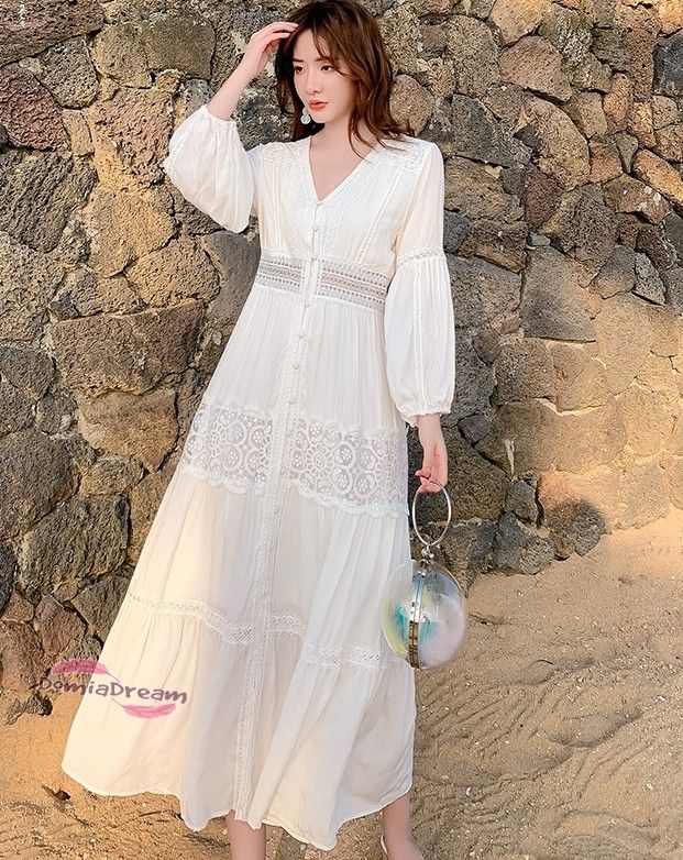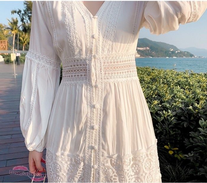 Long Dress Dress Long Skirt White Hollow Lace - S