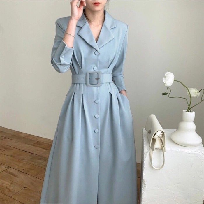 Long Dress Midi Long Dress Collar Blazer Trench Style Vintage Belt Korean - Brown
