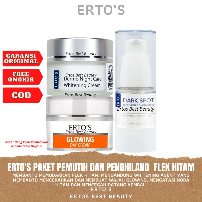 ERTOS PAKET PEMUTIH PENCERAH PELEMBAB WAJAH DAN PENGHILANG FLEK HITAM MEMBANDEL DI WAJAH BPOM - DARK SPOT SERUM ALL SKIN, GLOWING DAY & DERMO NIGHT CREAM