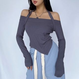 TERBARU 【Premium】99kOutlet Atasan Wanita Halter Neck Lengan Panjang Kaos Polos Asymmetric Off Shoulder (S/M/L)7284 T-Shi
