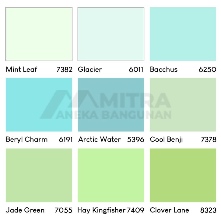 NEW WHITE/PUTIH, MINT LEAF 7382, GLACIER 6011, BACCHUS 6250, BERYL CHARM 6191, ARCTIC WATER 5396, COOL BENJI 7378, JADE GREEN 7055, HAY KINGFISHER7409, CLOVER LANE 8323, CORNSILK 1356, OLD LACE 1574, VANILLA ESSENCE 8189, PETALS 1156, ROSEY 1003, DISCUS 2035, WILTSHIRE CREAM 1648, SAND PEBBLE 1006, DESERT SAND 1037, JEWEL WHITE 2029, CANDY 2127, COTTON LACE 2594, SALSIFY 2535, OLD BRISTRE 2226, DEMI ROSA 0763, HEAVY CREAM 2595, ORCHID HEART 2537, PLUMTIC 3214, SMOOTH LATTE 2542, ENGLISH ROSE 3183, PINK LADY 3147, CANTAY 3241, SOFT LILAC 4448, LAVENDER DROPS 4391, REFLECTION 4446, URBAN LIGHT 4507, MIDNIGHT FLOSS 4521, ETERNAL BLUE 4108, STONEWASH DENIM 4401, MARINE BAY 5140, WHISPER BLUE 6009, HOLLOW LAPS 5395, PERSIA 5010, MISTRAL 4011, TIMELESS 1024, EXHALE 7637, OXFORD RIVER 9915, EMPIRE 0520, RAMAD 4200, VOGUE 4175, DISCUS 203.