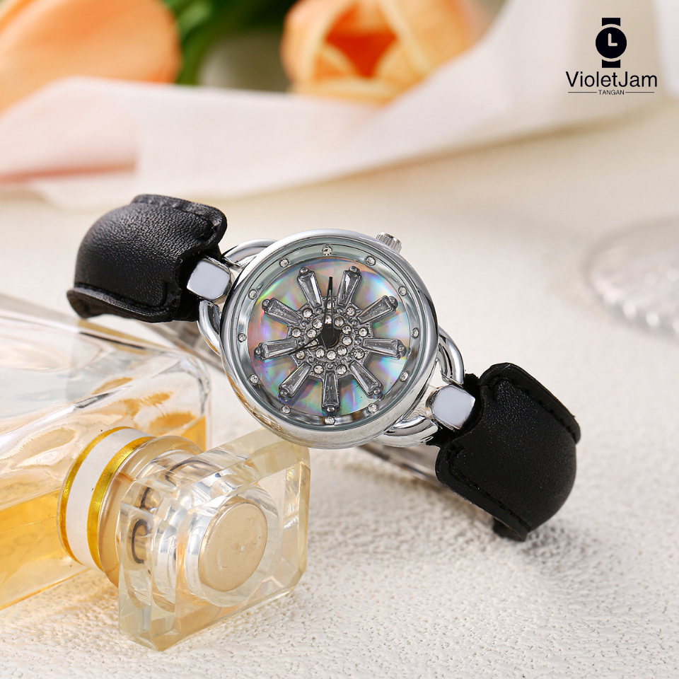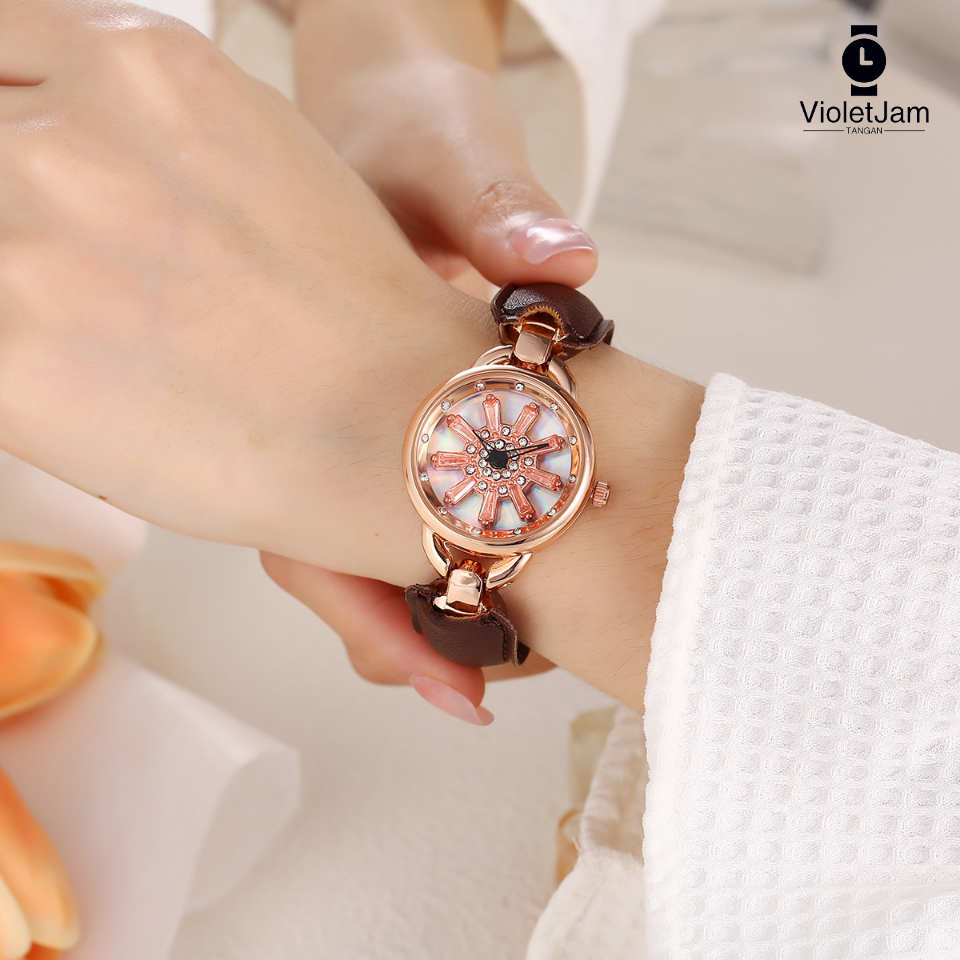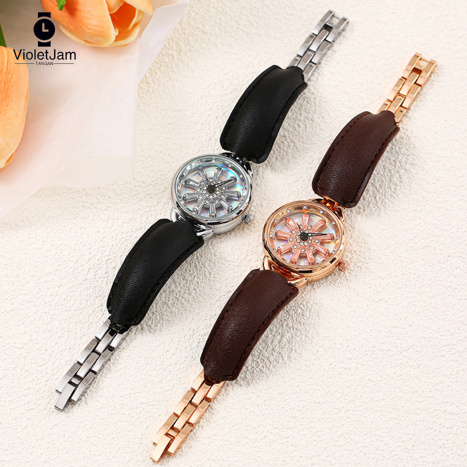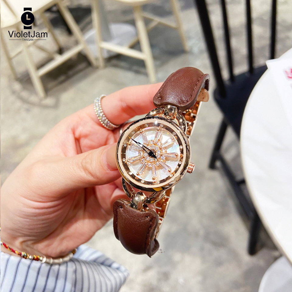 Jam Tangan Wanita Fashion Bulat Strap Kulit Rantai Simple Mewah Anti Air Jam Tangan Berputar