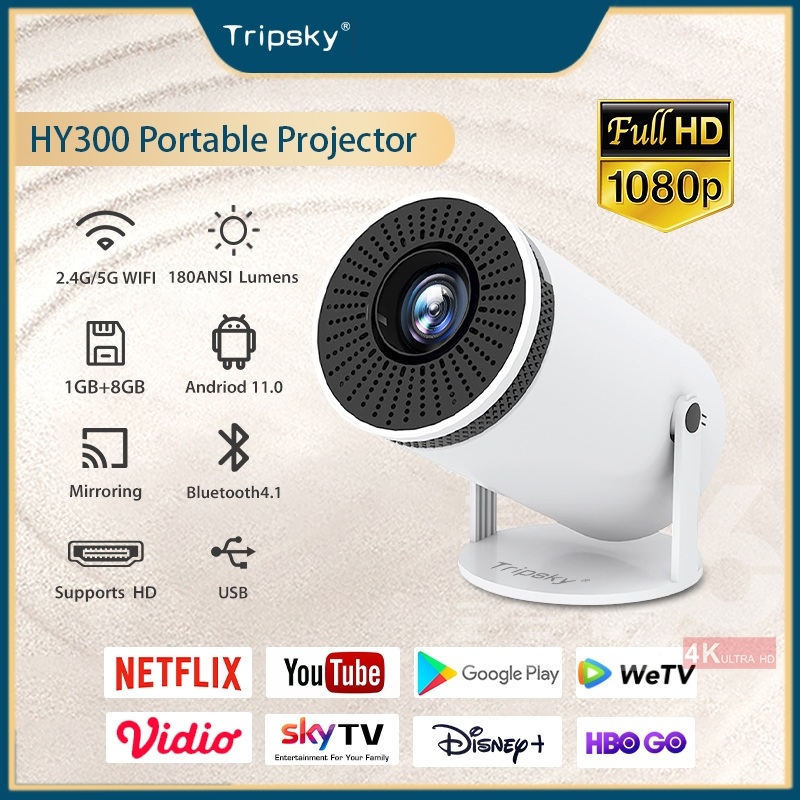 Tripsky HY300 Proyektor mini Portable HD Smart Projector Android 11 OS 180 Lumens Outdoor TV Proyektor