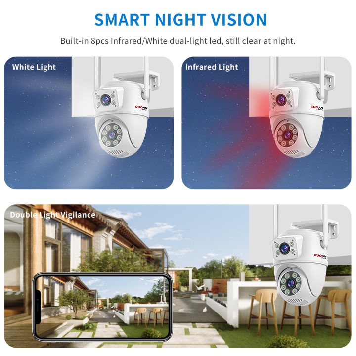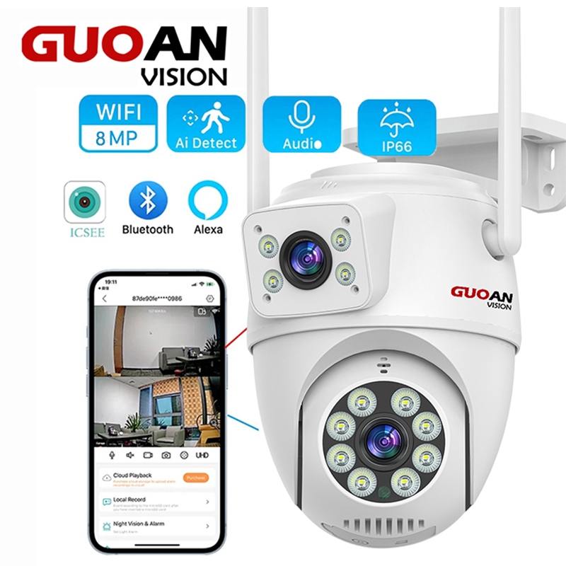 GUOANVISION CCTV Kamera 8MP iCSee PTZ Dual Lens Pelacakan Otomatis Ai Kamera Pengawasan Luar Ruangan Nirkabel