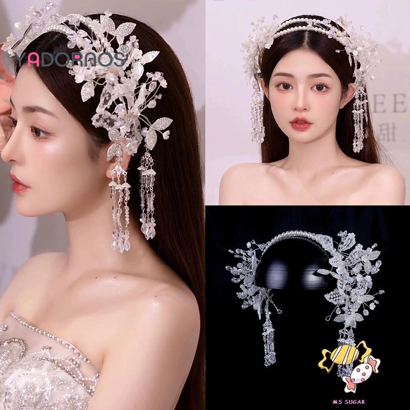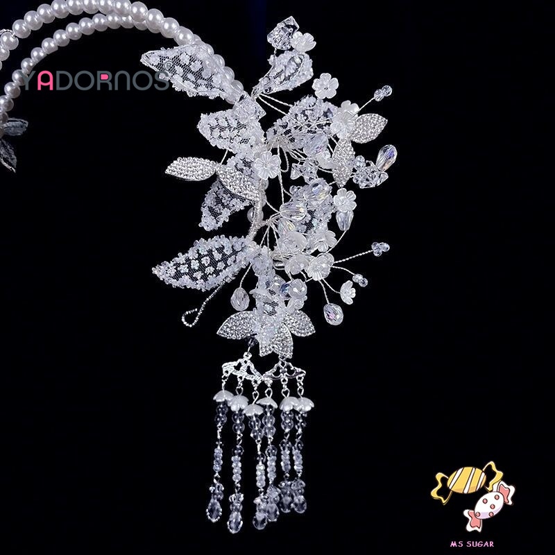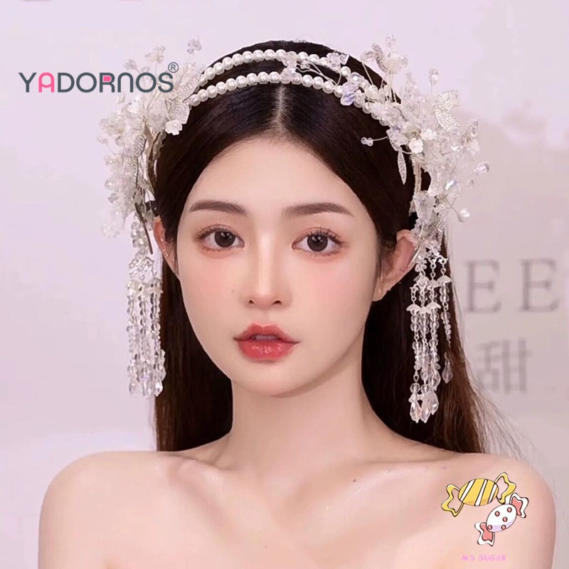 YADORNOS Ikat Kepala Rumbai Kristal Wanita - Ikat Kepala Mutiara Kasa Putih Buatan Tangan - Hiasan Kepala Pengantin Kore