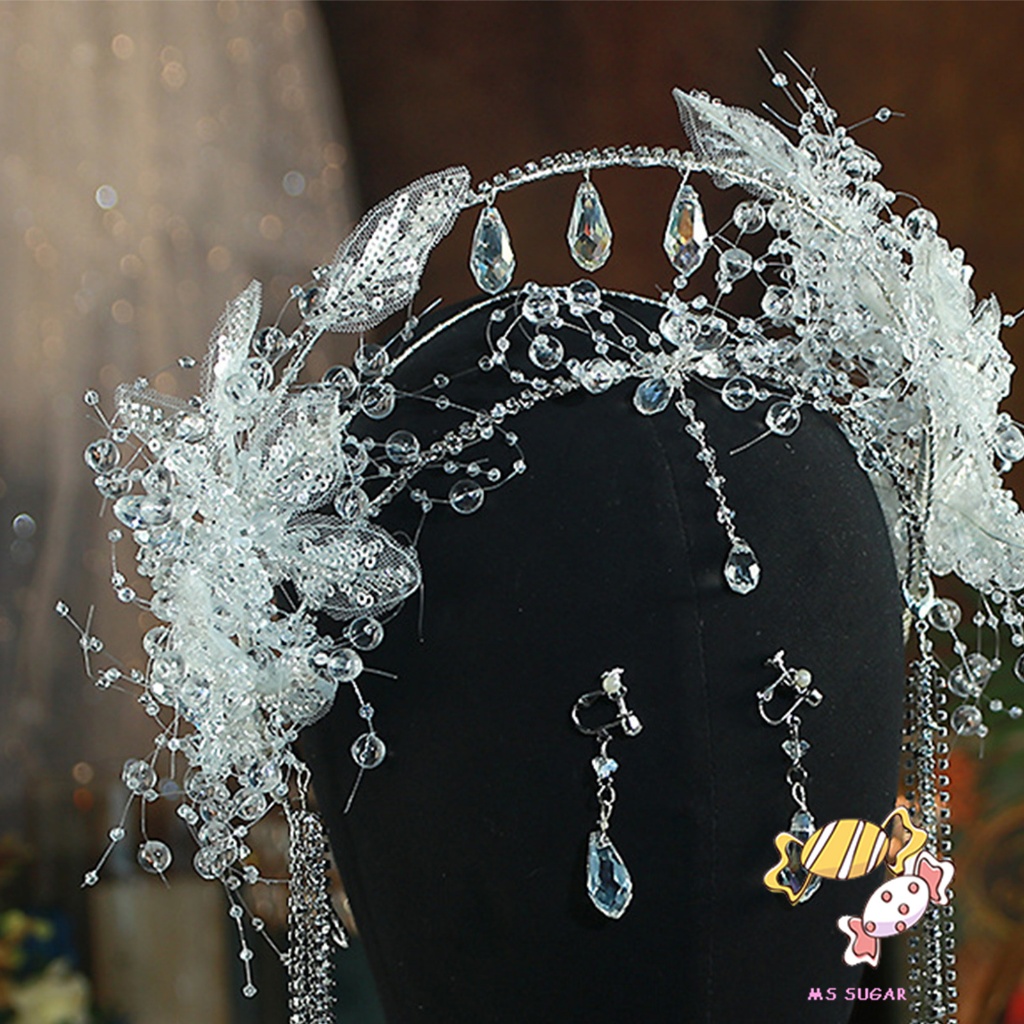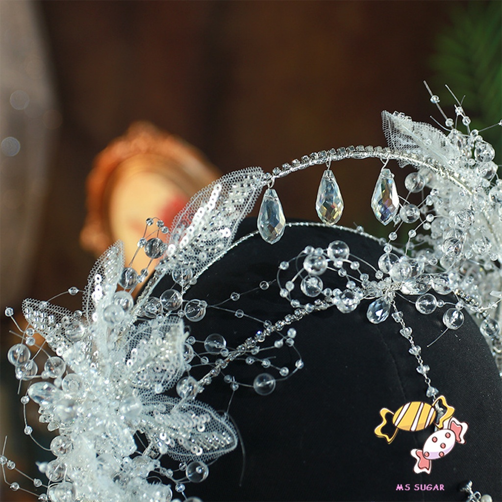 YADORNOS Aksesoris Rambut Pengantin, Pinggiran Kristal, Liontin Alis, Mahkota Perawan Kasa Putih, Aksesori Gaun Penganti