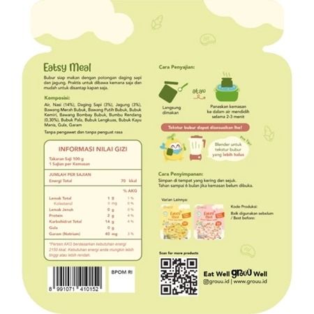 Grouu Eatsy Meals Bubur bayi instan atau siap saji Bubur bayi MPASI 6 bulan+ (tanpa gula, rendah garam)