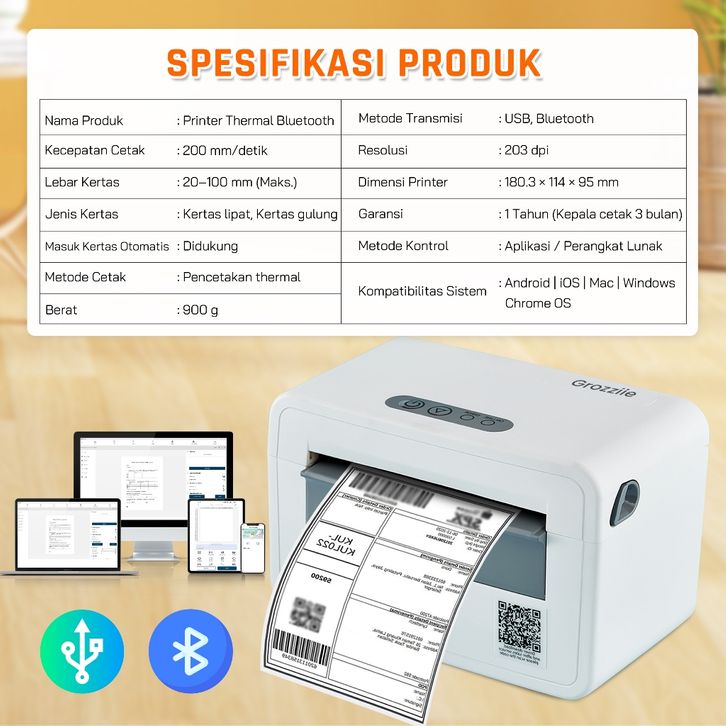 Printer Thermal Waybill | Cetak Lebel | Printer Label Sticker USB+Bluetooth 4 & 3 Inci