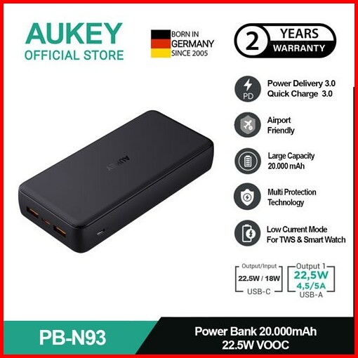 Aukey Powerbank 20000mah Pb-n93-bk Usb C 22.5w Pd 3.0 Slim