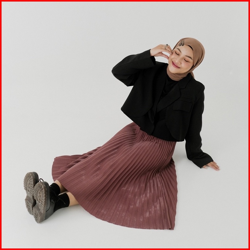 Ennie Rok Plisket Midi Wanita Pinggang Karet Polos