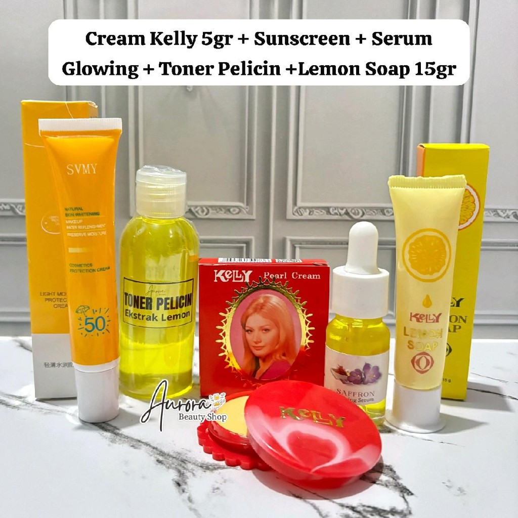isi 5 Paket Kelly Pearl cream 5gr + Sunscreen + Toner Pelicin+ Serum Saffron + Lemon Soap 15gr