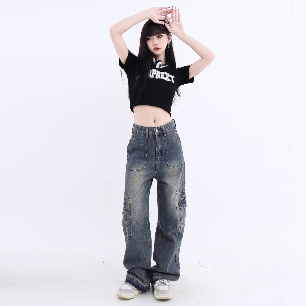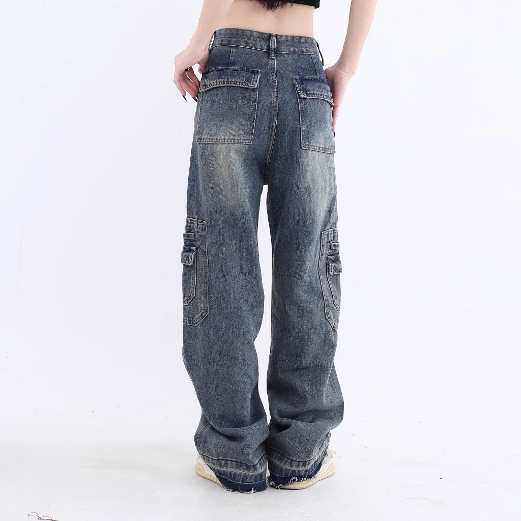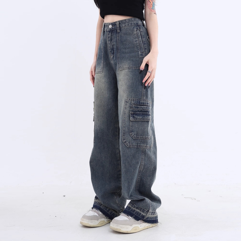 Celana Jeans Cargo Jeans Wanita Highwaist Kulot Loose Biru Retro Korea Style