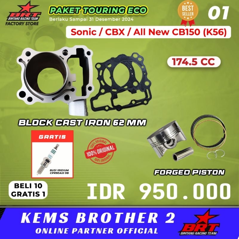 PAKET BORE UP BRT SONIC SUPRA GTR CBX K56 62 MM CASTING IRON FREE BUSI BRT TOTAL CC JADI 174.5 CC ORIGINAL BRT