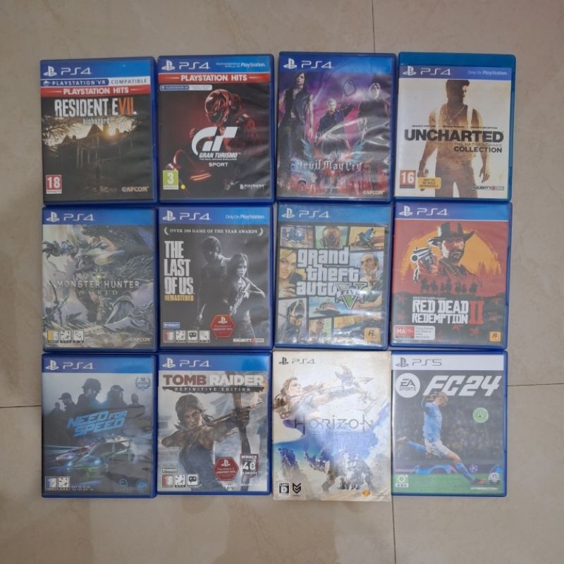 PS4 HZD CE, PS4 TLOU, PS4 STREET FIGHTER, PS5 EAFC24, PS4 GRAN TURISMO, PS4 BF1, PS4 BORUTO BHS JPN, PS4 RDR 2, PS4 DESTINY 2, PS4 FFXV