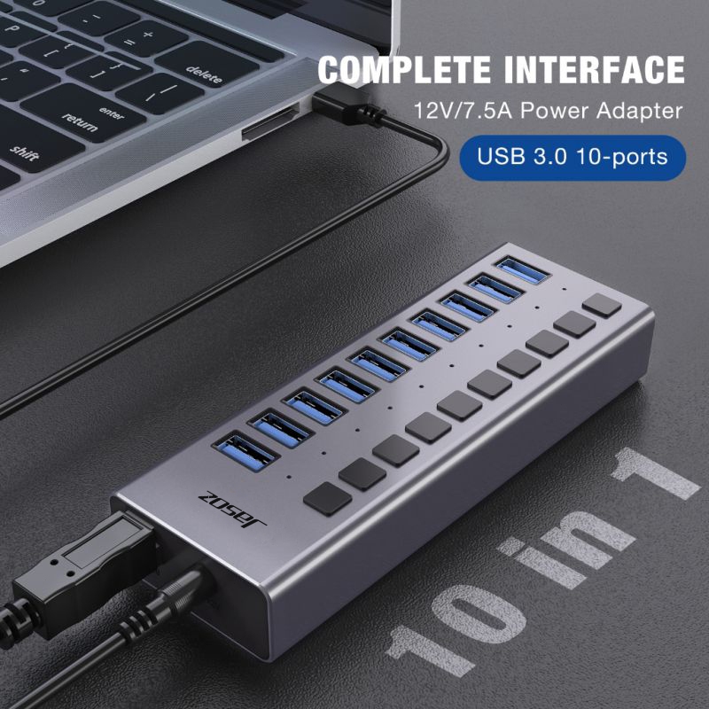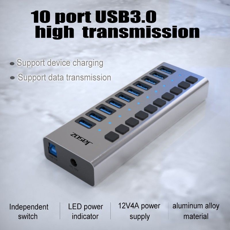 Jasoz 7/10 Port USB Hub With Individual Switches USB 3.0 Hub Splitter With External Power Adapter
